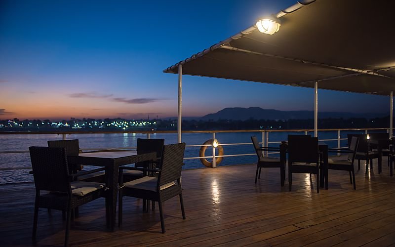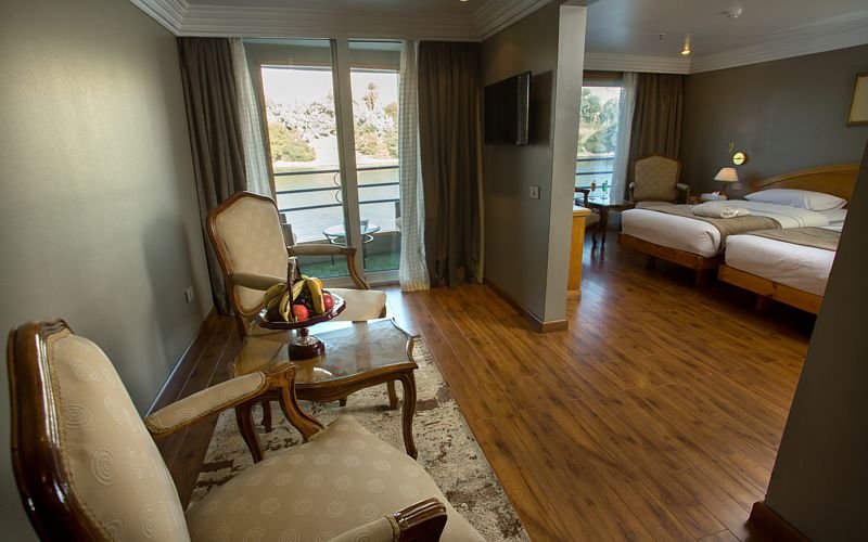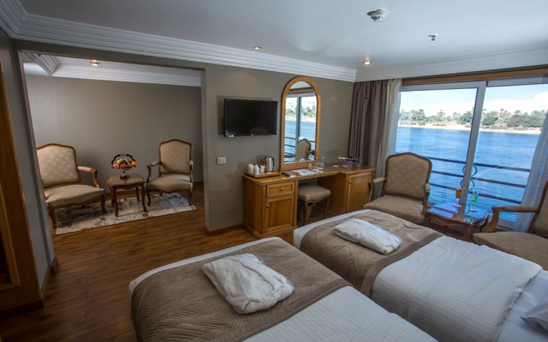 Indulge elegantly adorned, spacious cabins with all essentials, including AC, en-suite baths, and plush beds. Your balcony offers sweeping Nile River vistas, fostering relaxation.