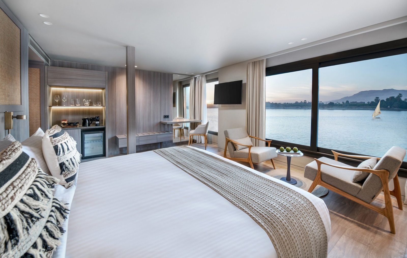 The Historia Luxury Nile Cruise boasts an impressive fleet of 60 luxurious cabins and suites, each thoughtfully designed with your utmost comfort in mind. Equipped with top-tier amenities, private balconies, and en-suite bathrooms, these accommodations offer a sanctuary of indulgence and relaxation throughout your voyage.