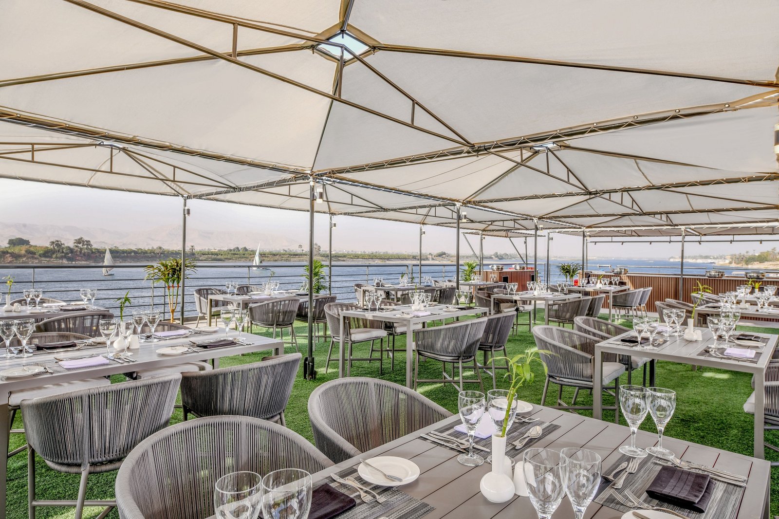 Dining aboard this magnificent cruise is a culinary delight, with the main restaurant offering a delectable array of dishes to satisfy your every craving. For more casual fare, the lounge bar is the perfect spot to relish light meals, and the rooftop bar or poolside lounges beckon you to sip cocktails while taking in breathtaking views of the timeless Nile River.